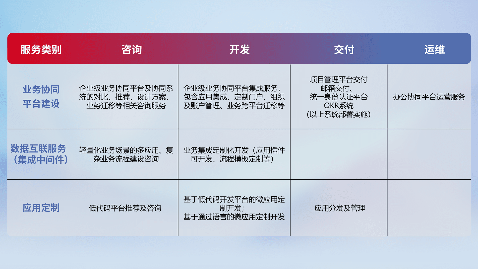 针对钉钉、、企微、、、IDaas等平台级产品提供产品的规划、、、、方案、、、交付、、、、定制化开发等服务,,,实现如统一协同办公、、、智能客户服务、、混合会议管理、、智能数据查询、、、等业务场景,,,,实现数字化转型。。。